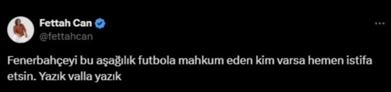 Şarkıcı Fettah Can, maç sonrasında sosyal medya hesabından sarı-lacivertli takımın teknik direktörü Jose Mourinho'yu istifaya davet etti.