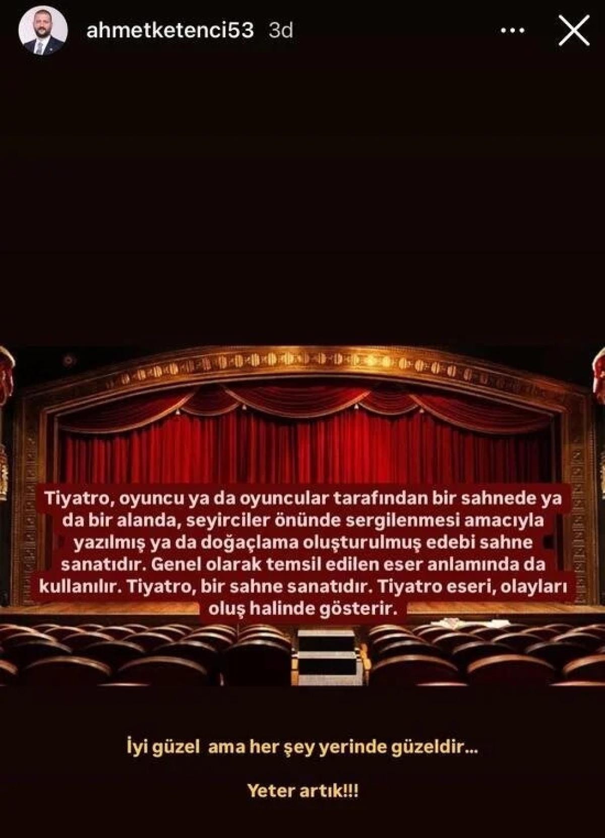Ahmet Ketenci, bir tiyatro perdesi fotoğrafı ve tiyatro tanımı paylaşarak altına, "İyi güzel ama her şey yerinde güzeldir. Yeter artık." yazdı.
