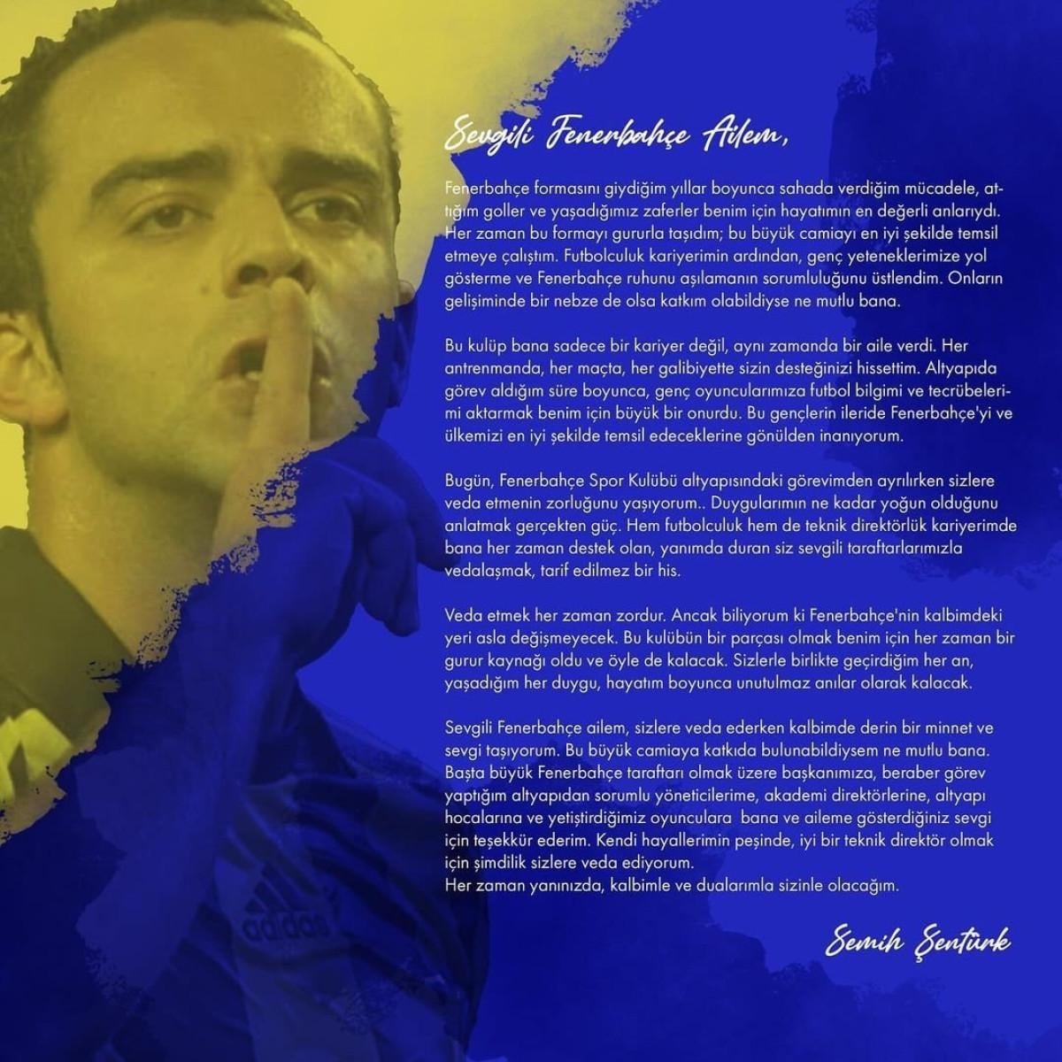 Fenerbahçe Futbol Akademisi'nde 2020 yılının sonunda göreve başlayan, 2023 yazında U19 Takımı'nın teknik direktörü olan Semih Şentürk, görevinden ayrıldığını açıkladı.