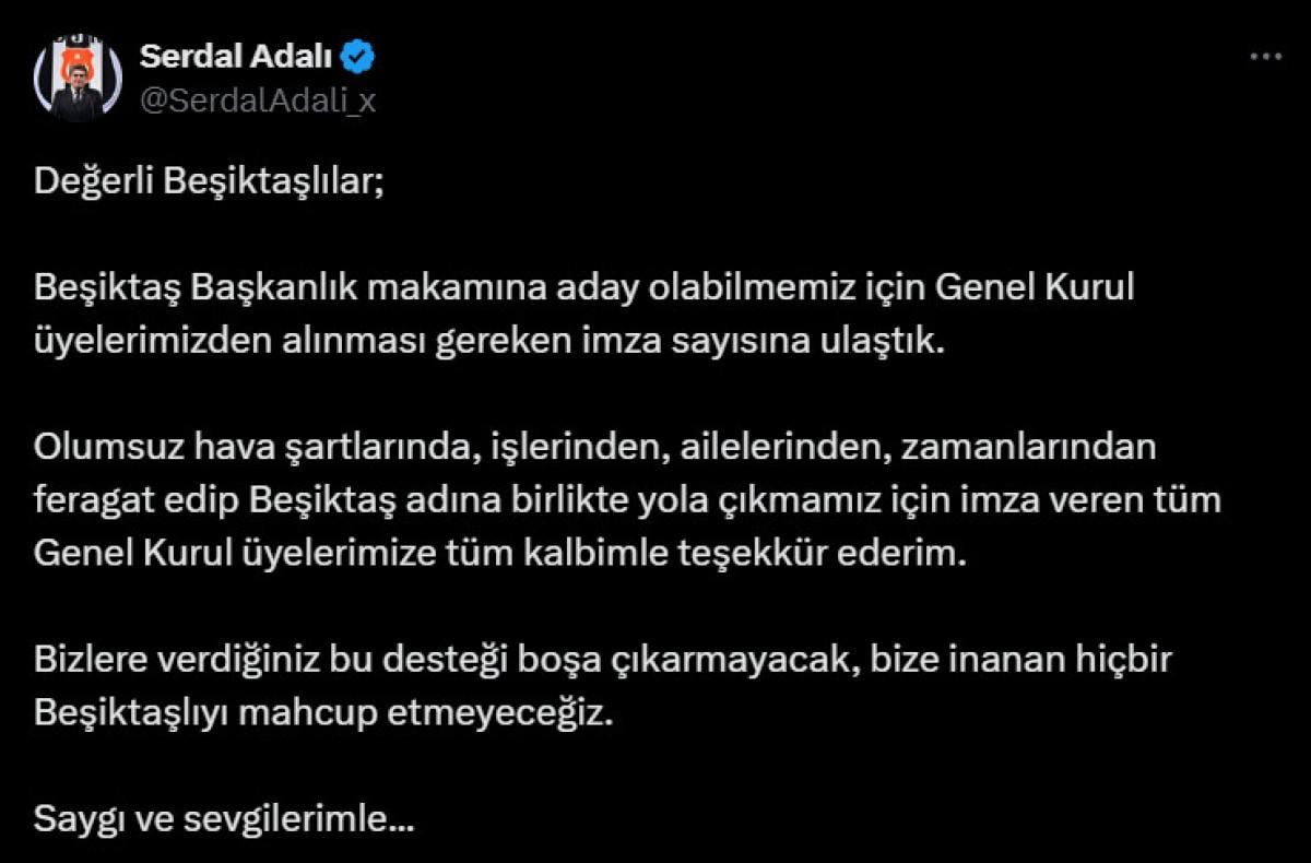 Beşiktaş Kulübü'nün 29 Aralık Pazar günü yapılacak olağanüstü seçimli genel kurulunda başkanlığa aday olan eski yöneticilerden Serdal Adalı, adaylık için gerekli imza sayısına ulaştığını bildirdi.