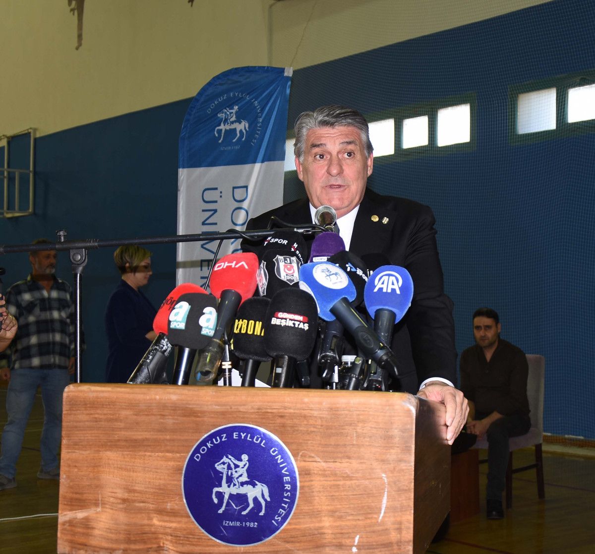Törende bir konuşma yapan siyah-beyazlı kulübün başkanı Serdal Adalı, "Bugün burada, şanlı tarihimize yeni bir altın sayfa eklerken, Beşiktaş’ımızın önümüzdeki 50 yılına katkı sunacak bir vizyonla attığımız adımı perçinlemenin gururunu yaşıyoruz. Bizler göreve geldiğimizde önemli bir söz verdik; 'Beşiktaş’ı hak ettiği zirveye, her alanda taşıyacağız' dedik. İşte bugün, bu sözün en somut adımlarından birini daha atıyoruz. Beşiktaşımız ile Dokuz Eylül Üniversitemiz arasındaki bu kıymetli dayanışmayı iş birliği ve pilot takım protokolü ile taçlandırıyoruz. Beşiktaş denince akla 'öz kaynak' gelir. Ancak dünya değişiyor, biz de futbol endüstrisindeki bu değişime ayak uydurmak değil, yön vermek zorundayız. Bu doğrultuda, Avrupa’da bir ilki gerçekleştirerek, bir spor kulübü ile bir üniversitenin en kapsamlı iş birliğini hayata geçirdik. Beşiktaş olarak Dokuz Eylül Üniversitesi Kooperatifi ile el ele vererek İzmir’de dev bir altyapı hamlesini başlattık ve 'Geleceğin Kartallarını Yetiştirme' projemizi hayata geçiriyoruz. Bu proje, sıradan bir spor okulu veya bir ticari yapı değildir. Merkez Yerleşkesi'nden Balçova'ya, Buca'dan Dokuzçeşmeler'e kadar üniversitenin dört farklı kampüsünde; futbol, basketbol, voleybol ve jimnastik branşlarında yüzlerce gencimizi eğitiyoruz. Yönetim tamamen İstanbul’daki Hakkı Yeten ve Süleyman Seba merkezlerimizle entegre şekilde sağlanıyor. Yani İzmir’deki yavrumuz, İstanbul’daki evladımızla aynı eğitimi, aynı disiplini alıyor. Balçova Sağlık Yerleşkemizdeki modern salonlarımızdan, merkez yerleşkemizdeki uluslararası standartlara sahip sahalarımıza kadar her detay, Beşiktaş kalitesine yakışır şekilde dizayn edildi. Gerçekten gurur verici. Buradaki amacımız gençlerimize sadece teknik beceri kazandırmak değil; toplumumuza disiplinli, ahlaklı ve özgüvenli bireyler yetiştirmek. Üstelik bu projenin çok kıymetli bir sosyal yönü daha var: Buradan elde edilen gelirle üniversite öğrencilerimize burs fonu oluşturuyoruz. Yani Beşiktaş, sadece sporcu değil, Türkiye’nin aydınlık geleceğini de destekliyor. Yetenekli gençlerimizi ise pilot takımımız Dokuz Eylül Üniversitesi SK üzerinden lisanslayıp, doğrudan Beşiktaş Akademisi’ne kazandıracağız." ifadelerini kullandı.