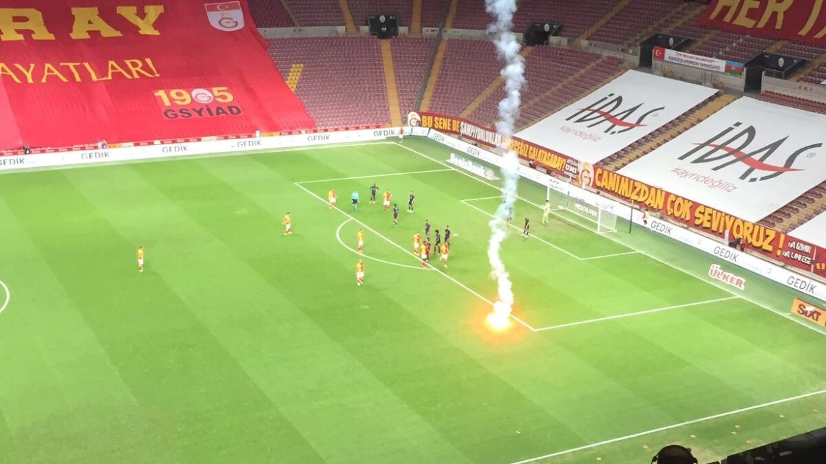 Koronavirüs nedeniyle seyircisiz olarak oynanan maçta sahaya meşale atıldı.