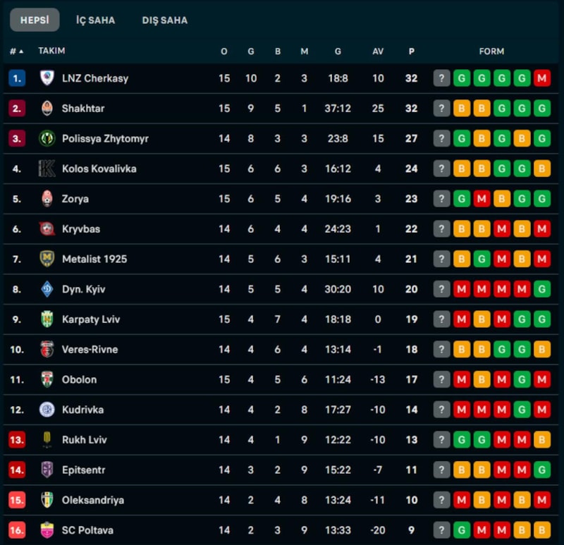 UKRAYNA LİGİ'NDE PUAN DURUMU