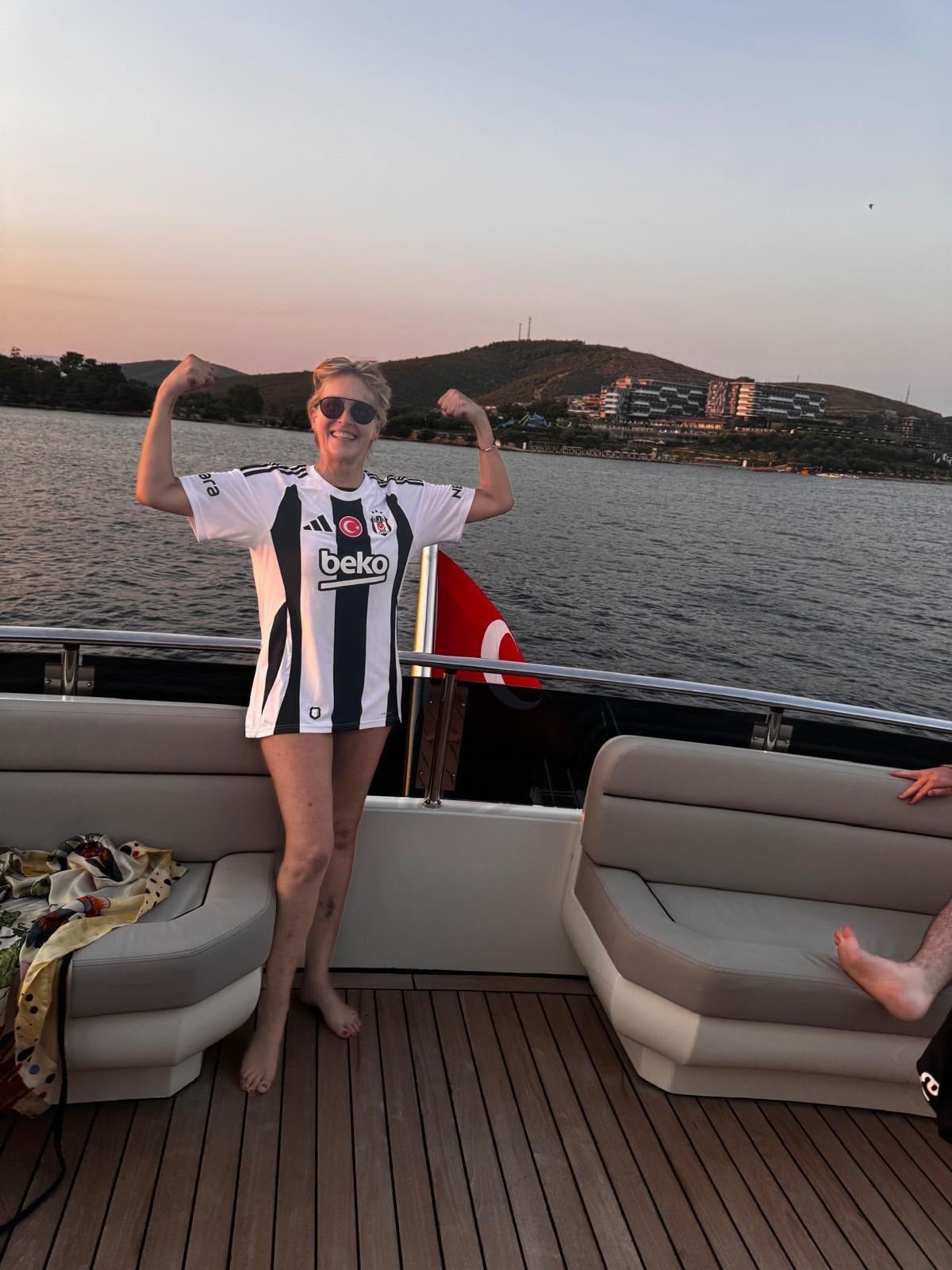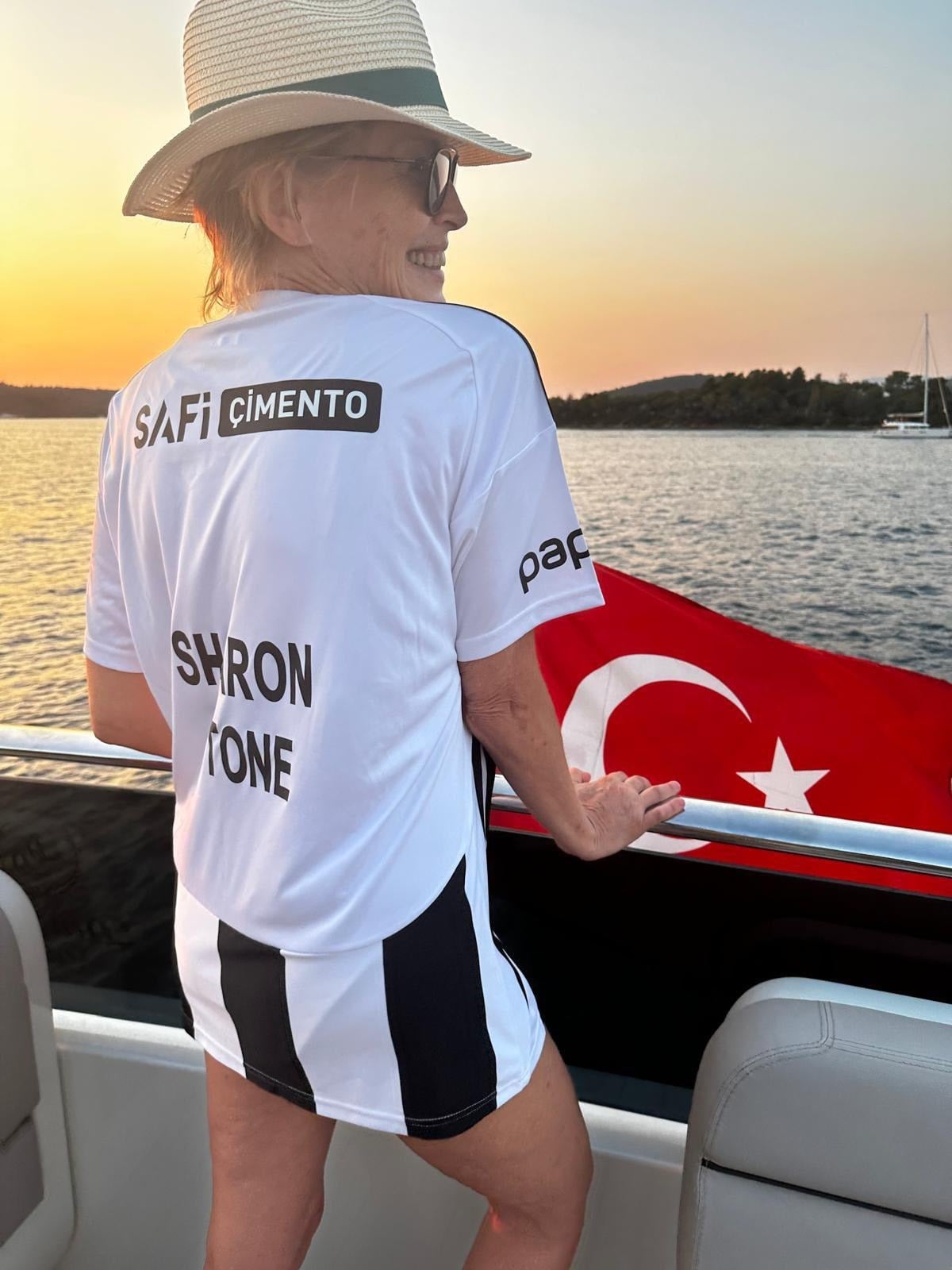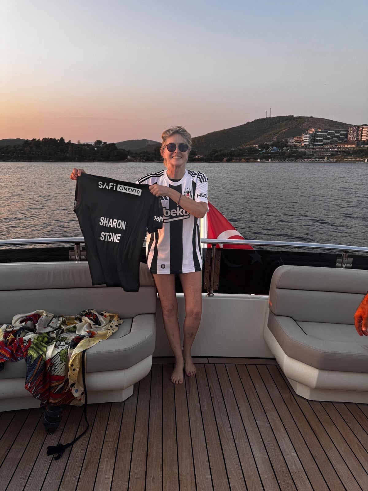 Dünyaca ünlü Hollywood yıldızı Sharon Stone, Golden Globe ödül töreni için geldiği Türkiye'de, Bodrum'da Beşiktaş formasıyla dikkatleri üzerine çekti.
