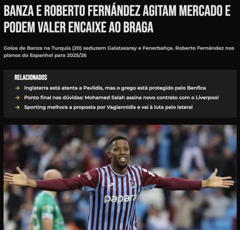Portekiz basınından O Jogo, Trabzonspor'un golcüsü Simon Banza'nın Fenerbahçe ve Galatasaray'ın radarında olduğunu yazdı. İki takımın da Banza ile ilgilendiği iddia edildi.
