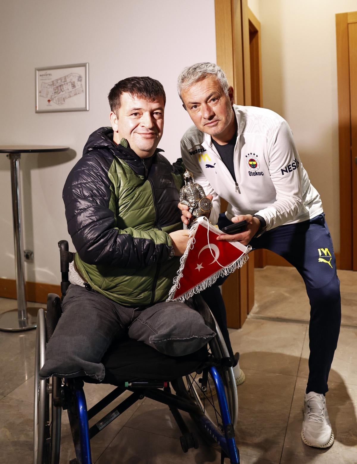 Şırnak’ta 2007 yılında vatani görevini yaparken mayın patlaması sonucu iki bacağını kaybeden Konyalı gazi Hasan Kocamaz, Fenerbahçe Teknik Direktörü Jose Mourinho ile bir araya gelerek unutulmaz bir an yaşadı.
