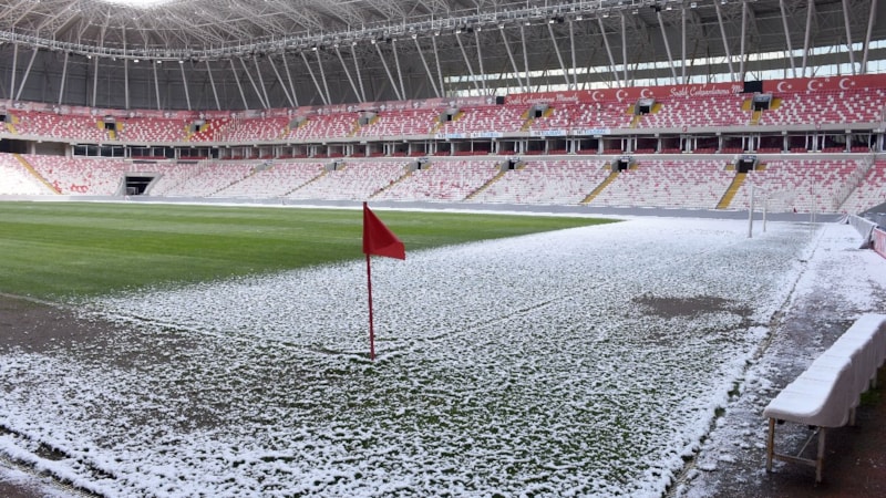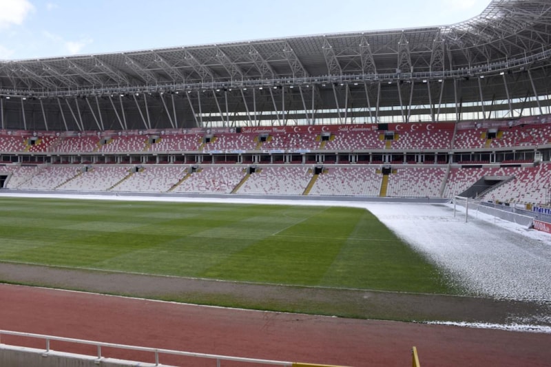 Süper Lig'in 31'inci haftasında yarın Sivasspor ile Fenerbahçe'nin karşı karşıya geleceği 4 Eylül Stadı'nın zemini dün geceki kar yağışı ve soğuk hava nedeniyle kısmen karla kaplandı.