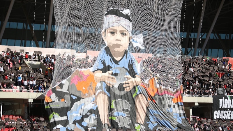 Ayrıca iki takımın futbolcuları da seremoniye ellerinde "Gazze'deki soykırıma sessiz kalma" yazılı pankartla çıktı.