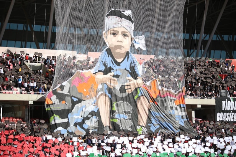 Gazze'de yaşanan insanlık dramına dikkat çekmek amacıyla düzenlenen bu anlamlı destekte, Sivasspor taraftarı sadece futbol için değil; kardeşlik, dayanışma ve insanlık için tribünlerde yerini aldı.