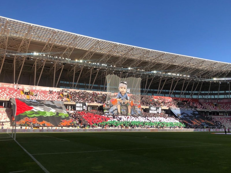 Sivassporlu taraftarlar, Serikspor maçı öncesinde Gazze'deki soykırıma sessiz kalmamak amacıyla koreografi yaptı.