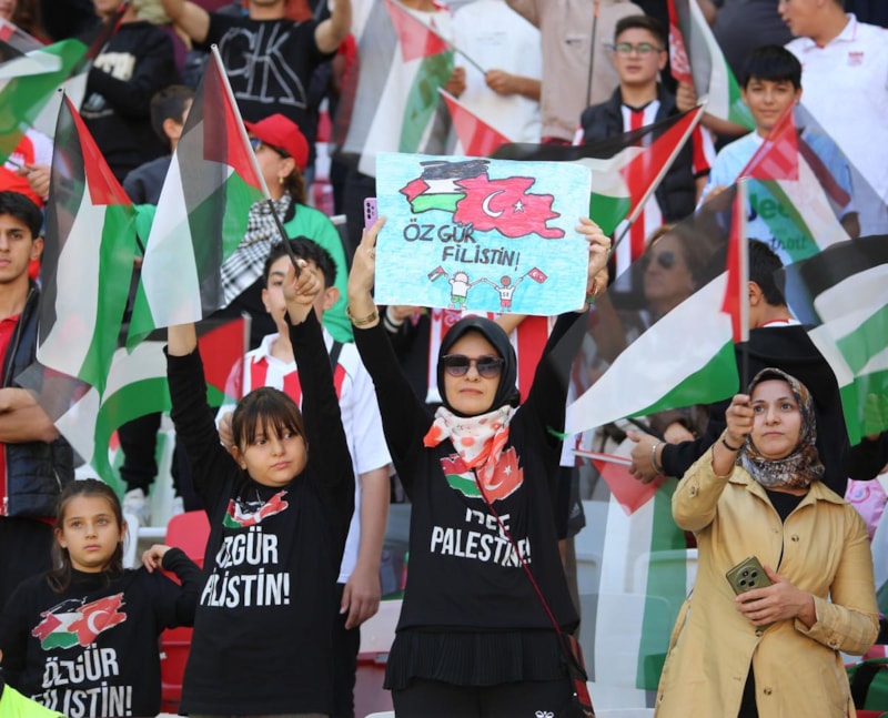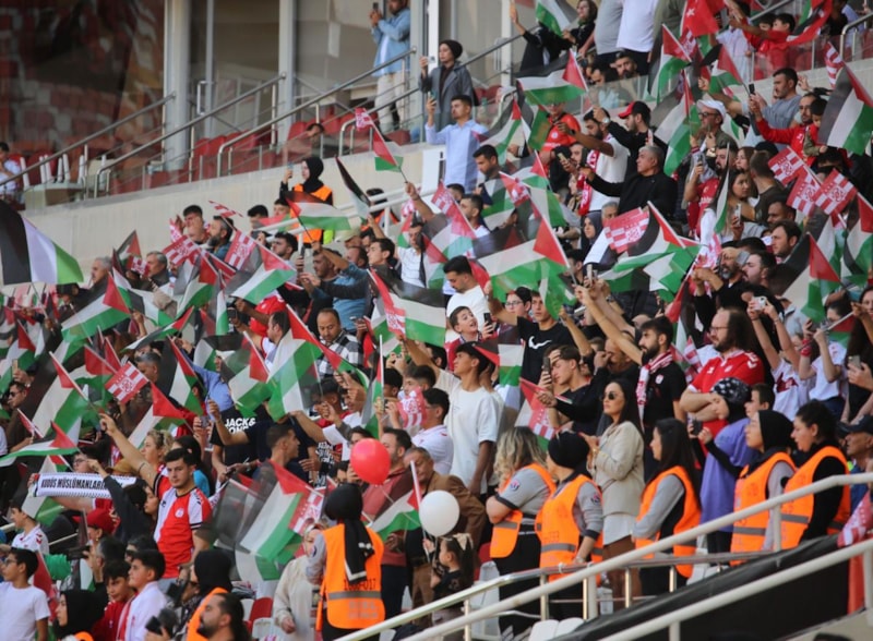 Tribünlerde kırmızı-beyazlı renklerin yanı sıra Filistin bayrakları da dalgalandı.