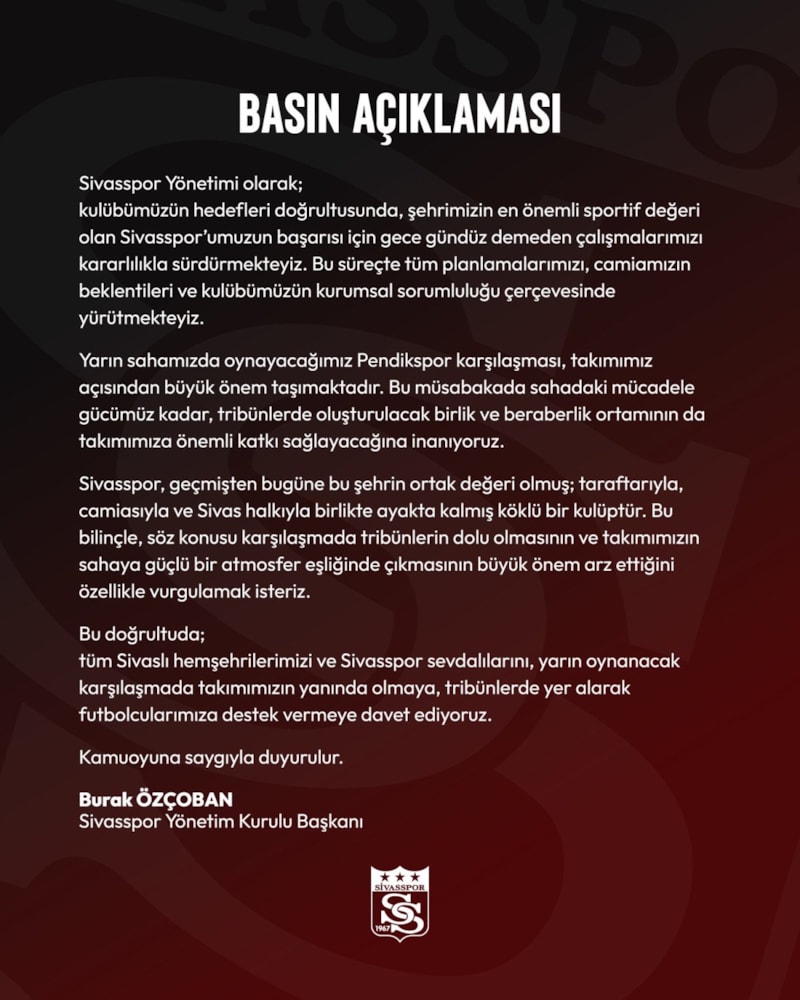 Yarın sahamızda oynayacağımız Pendikspor karşılaşması, takımımız açısından büyük önem taşımaktadır. Bu müsabakada sahadaki mücadele gücümüz kadar, tribünlerde oluşturulacak birlik ve beraberlik ortamının da takımımıza önemli katkı sağlayacağına inanıyoruz. Sivasspor, geçmişten bugüne bu şehrin ortak değeri olmuş, taraftarıyla, camiasıyla ve Sivas halkıyla birlikte ayakta kalmış köklü bir kulüptür. Bu bilinçle, söz konusu karşılaşmada tribünlerin dolu olmasının ve takımımızın sahaya güçlü bir atmosfer eşliğinde çıkmasının büyük önem arz ettiğini özellikle vurgulamak isteriz. Bu doğrultuda, tüm Sivaslı hemşehrilerimizi ve Sivasspor sevdalılarını, yarın oynanacak karşılaşmada takımımızın yanında olmaya, tribünlerde yer alarak futbolcularımıza destek vermeye davet ediyoruz.