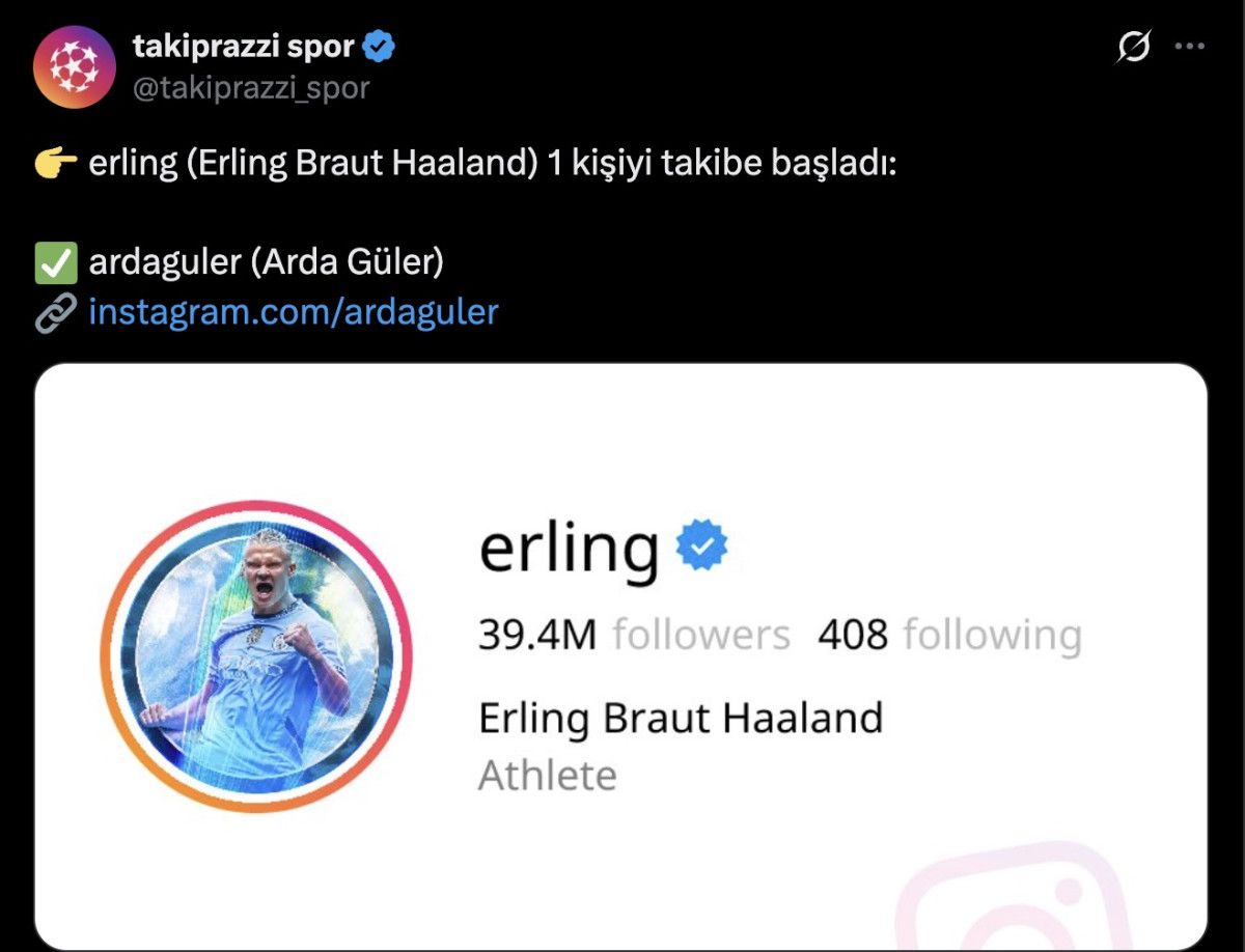 Ortaya çıkan karenin ardından Haaland, Arda Güler'i Instagram'dan takibe aldı.