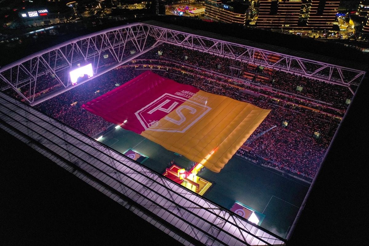 Tribünlerde ışık gösterileri yapılırken, stadyumun üstüne de 24. Süper Lig şampiyonluğuyla ilgili bayrak açıldı.