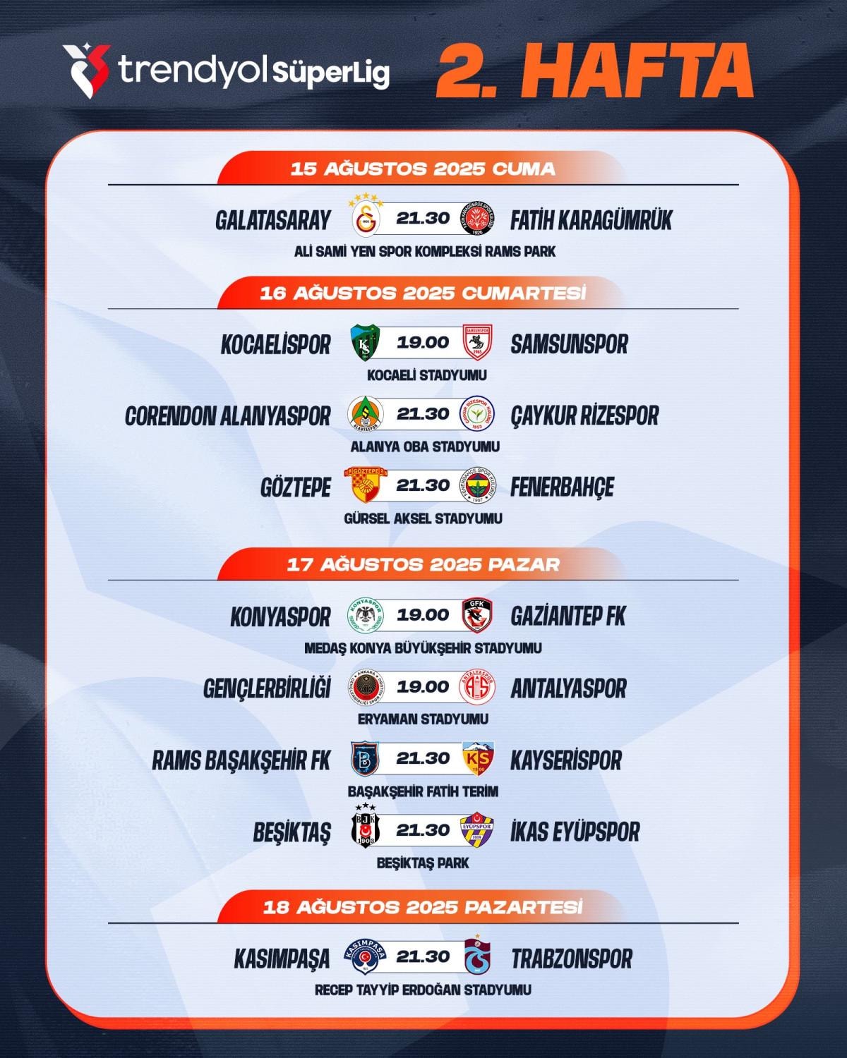 Süper Lig'de 2025-2026 sezonunun 1. ve 2. hafta müsabakalarına ilişkin program açıklandı.