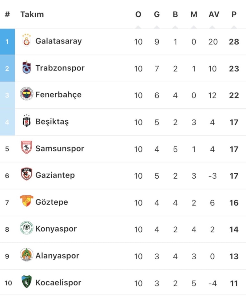 Süper Lig'de 10. hafta karşılaşmaları tamamlandı. Galatasaray, Fenerbahçe ve Trabzonspor haftayı kayıpsız atlatırken Beşiktaş ise Kasımpaşa engeline takıldı. İşte puan durumunda son görünüm...
