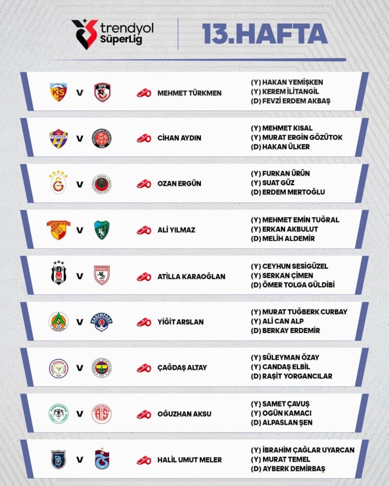 Süper Lig'de 13. haftanın programı ve hakemler şöyle: