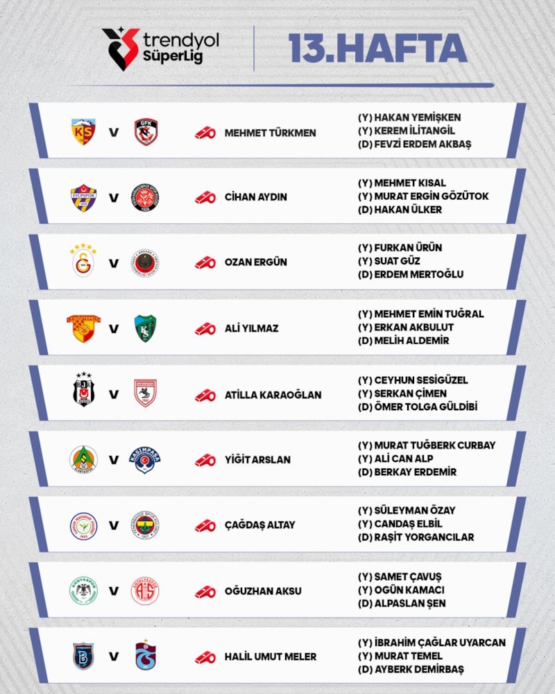Süper Lig'in 13. haftasında oynanacak karşılaşmalarda düdük çalacak hakemler açıklandı.