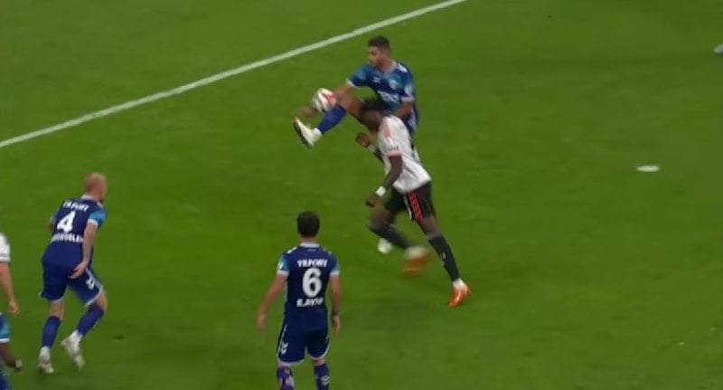 Hakem Atilla Karaoğlan, "Sağ koluna teması gördüm. Başka bir açı gösterir misin? Tekme mi bu bilerek oynama mı ona bir bakacağım. Ben oynuyor olarak görüyorum. Sağ ayağıyla oynuyor, daha sonra sağ eline geliyor" yorumunu yaptı.