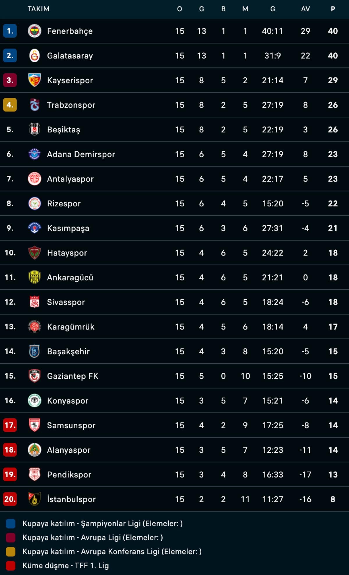 Adana Demirspor'u deplasmanda 3-1'le geçen Galatasaray da 40 puanla haftayı 2. sırada noktaladı.