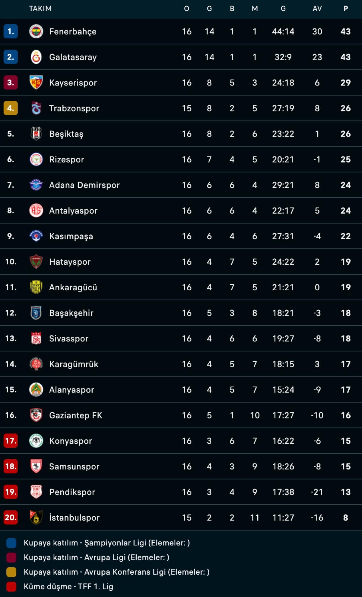 Konuk ettiği Fatih Karagümrük'ü 1-0'la geçen Galatasaray da 43 puanla haftayı 2. sırada noktaladı.
