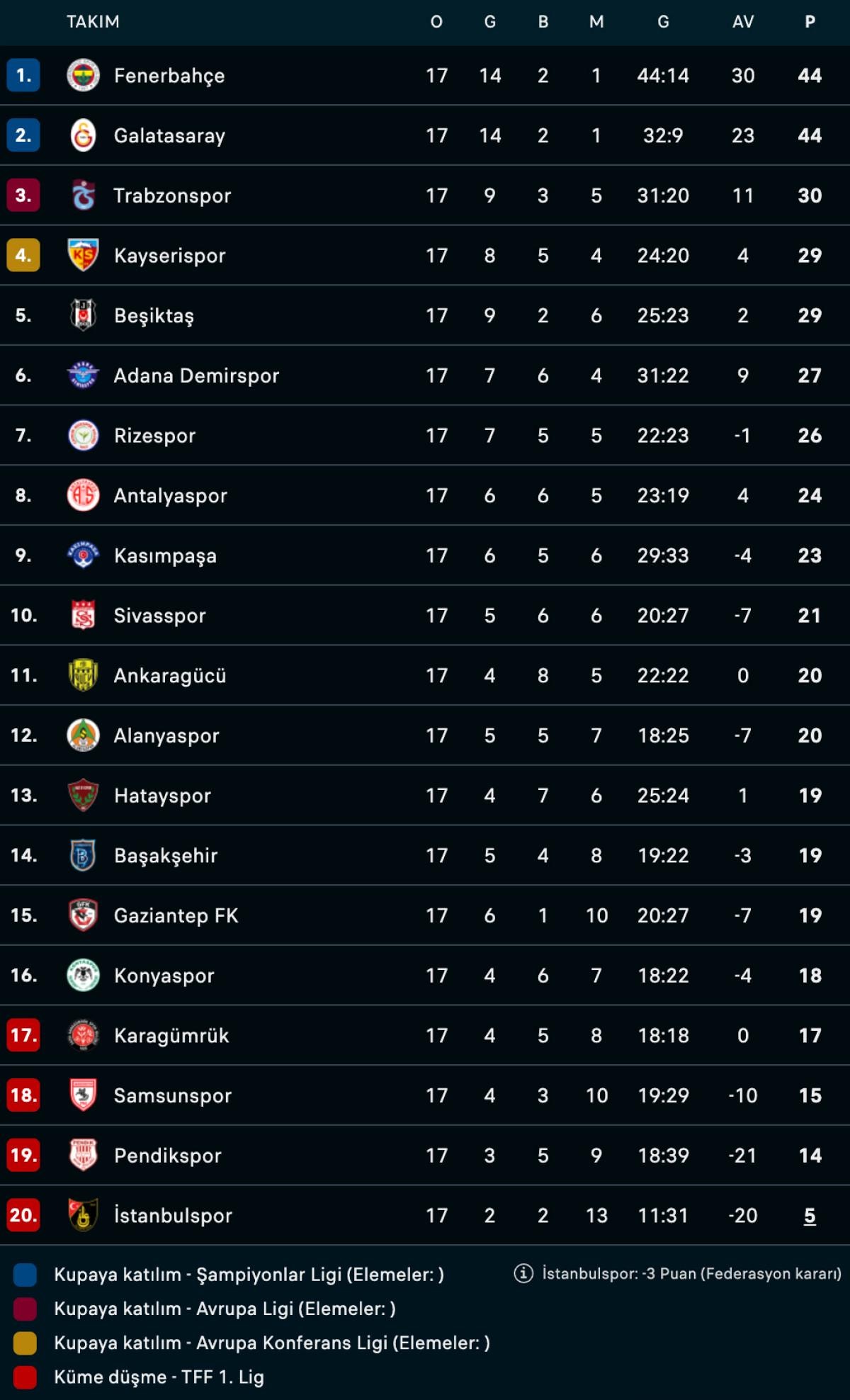 Haftaya averajla liderlik koltuğunda giren Fenerbahçe, derbide ağırladığı takipçisi Galatasaray ile 0-0 berabere kalarak liderliğini sürdürürken aynı puana sahip olan Galatasaray, 2. sırada yer aldı.