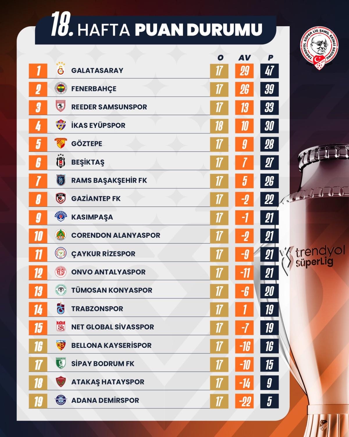 Önceki gün oynanan müsabakada zirvede yer alan namağlup Galatasaray, Göztepe'yi 2-1 mağlup ederek puanını 47'ye çıkardı.