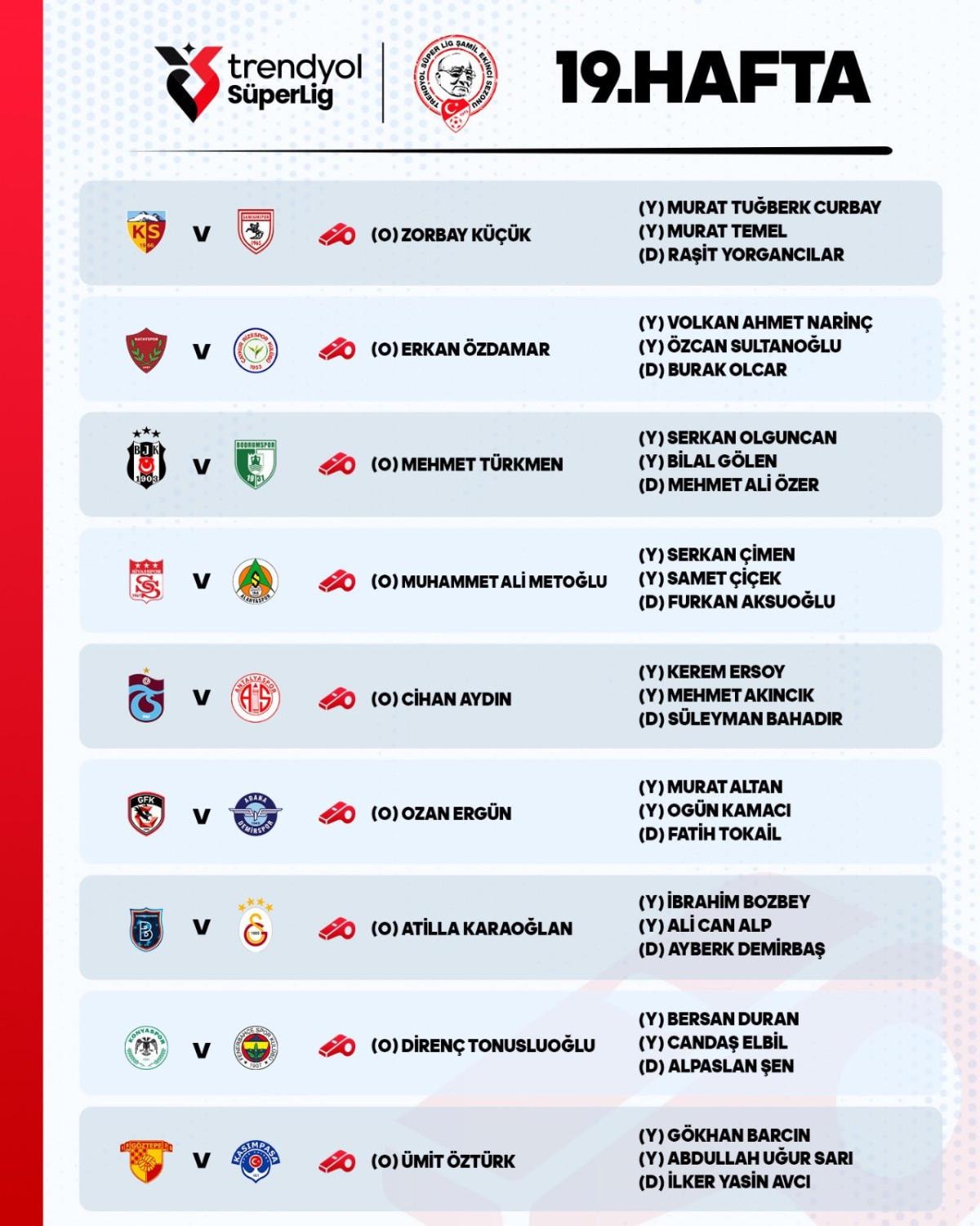 Süper Lig'in 19. haftasında oynanacak maçları yönetecek hakemler belli oldu.
