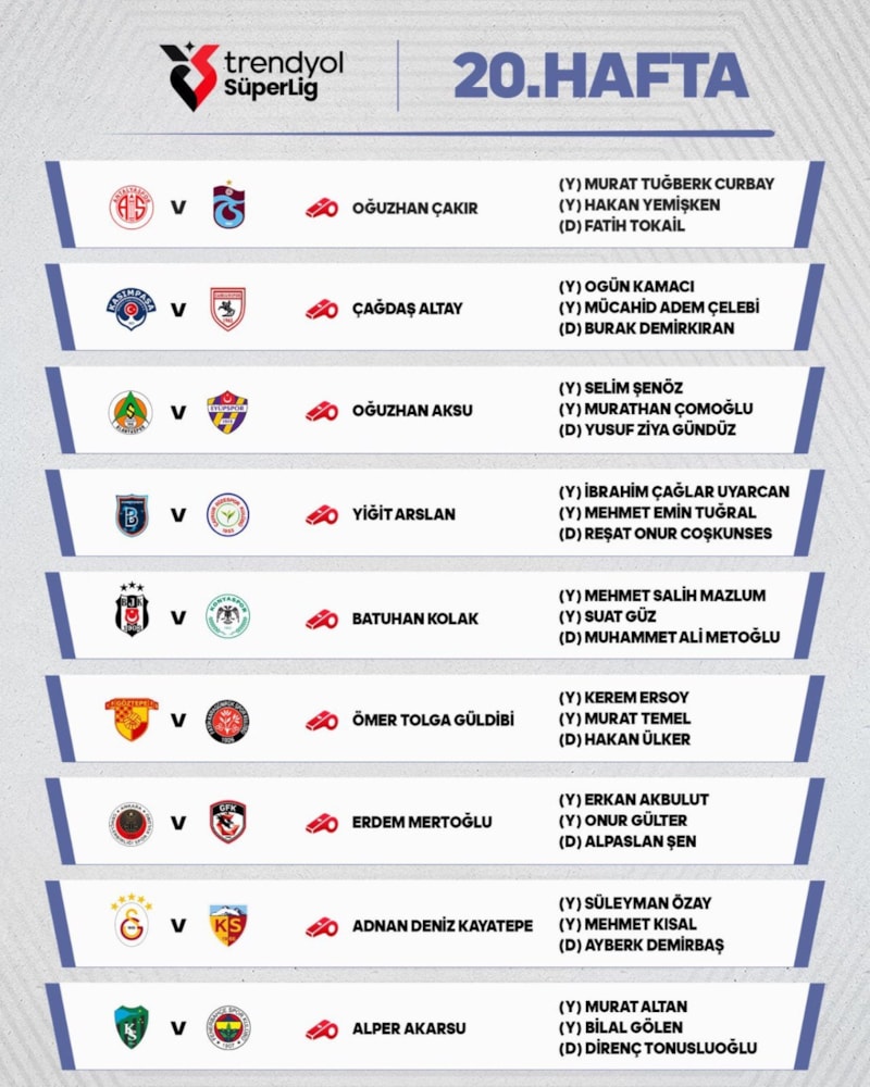 Süper Lig'in 20. haftasında oynanacak müsabakaları yönetecek hakemler açıklandı.