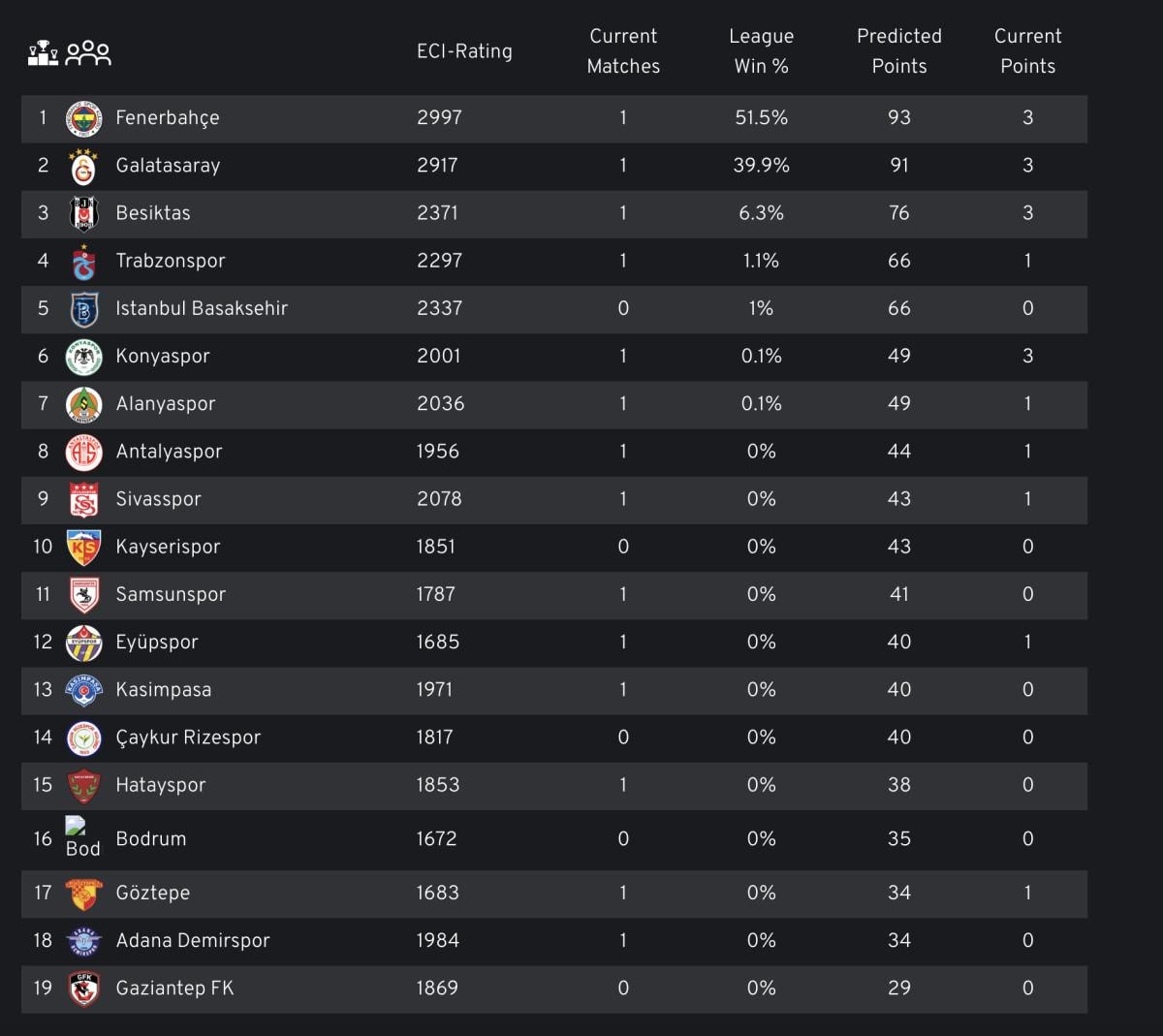 9 Ağustos tarihinde Galatasaray - Hatayspor maçıyla start alan ligde ilk haftanın heyecanı yaşanırken futbol veri sitesi Euro Club Index ilk şampiyonluk tahminini yaptı.