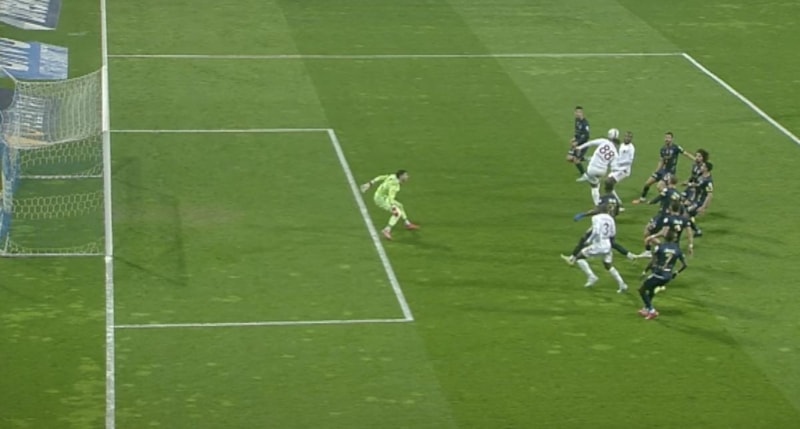VAR: Hücum oyuncusu topla oynuyor ve sonrasında bacağına vuruyor. Sana diğer arka kameradan göstereceğim. Tamam, daha fazlasına ihtiyacın varsa yavaş çekim göstereceğim.