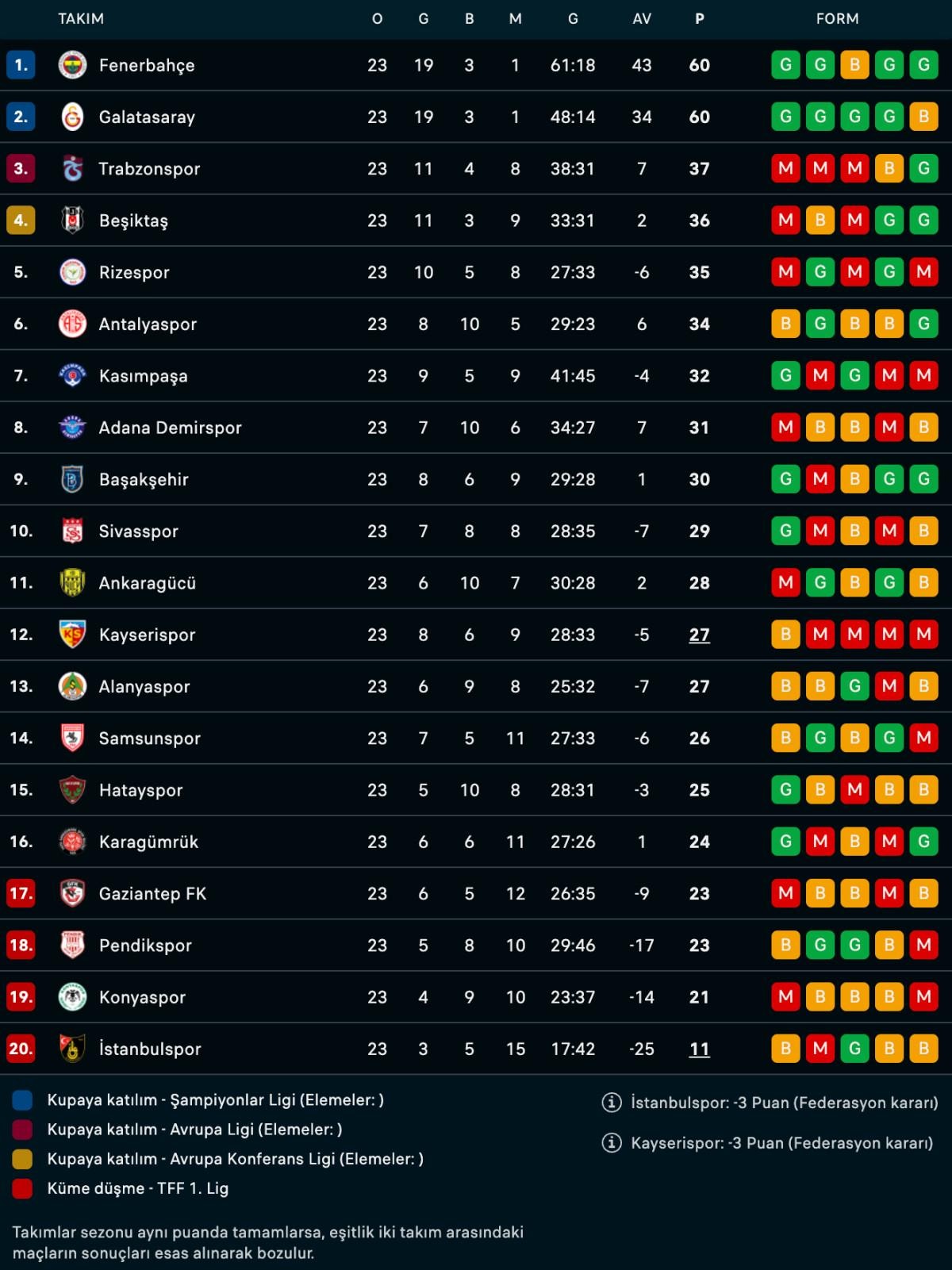 Önceki gün oynanan maçta Ankaragücü'nü 2-1 mağlup eden Fenerbahçe averajla liderliğini devam ettirirken Sivasspor'a 1-0 kaybeden Beşiktaş'ın kötü gidişatı devam etti.
