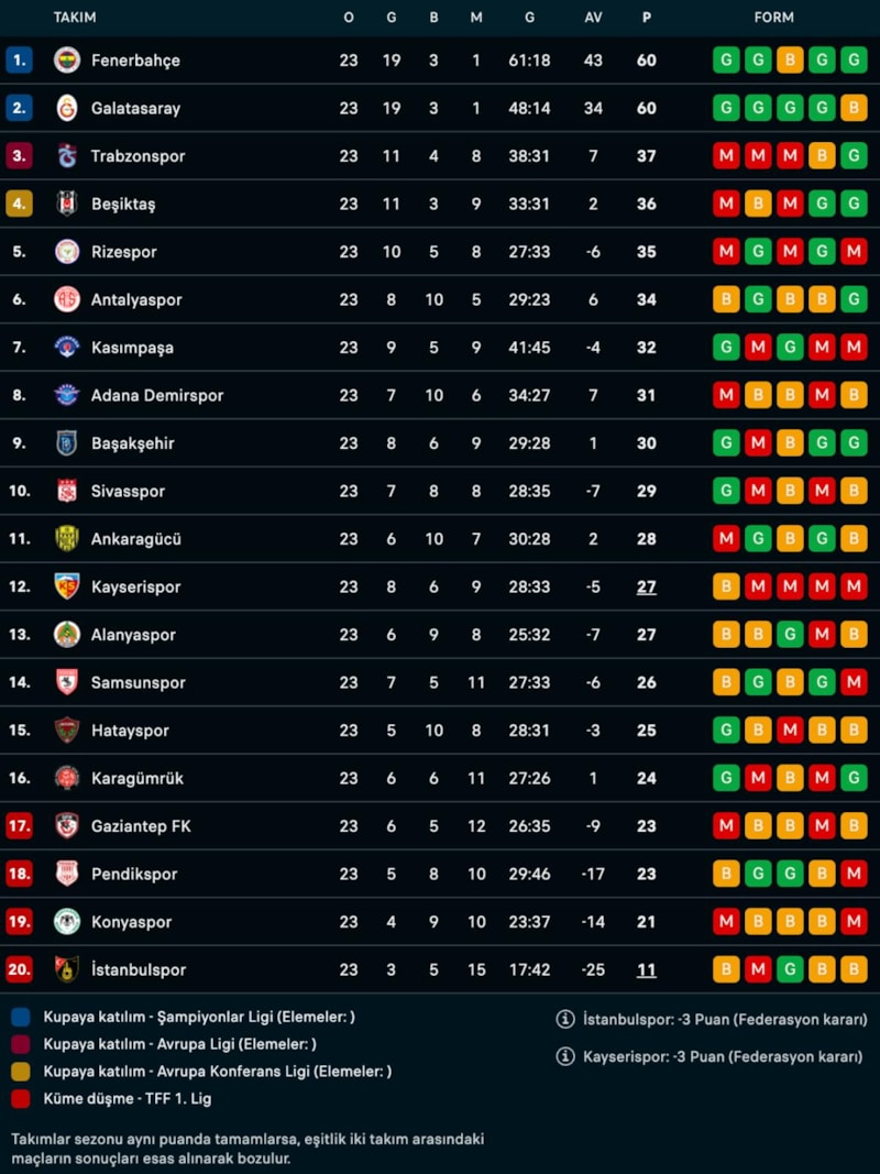 Süper Lig'de 23. hafta tamamlandı. Aynı puana sahip iki takımdan Fenerbahçe'nin averajla liderliği devam ederken Galatasaray ise 2. sırada yer aldı.