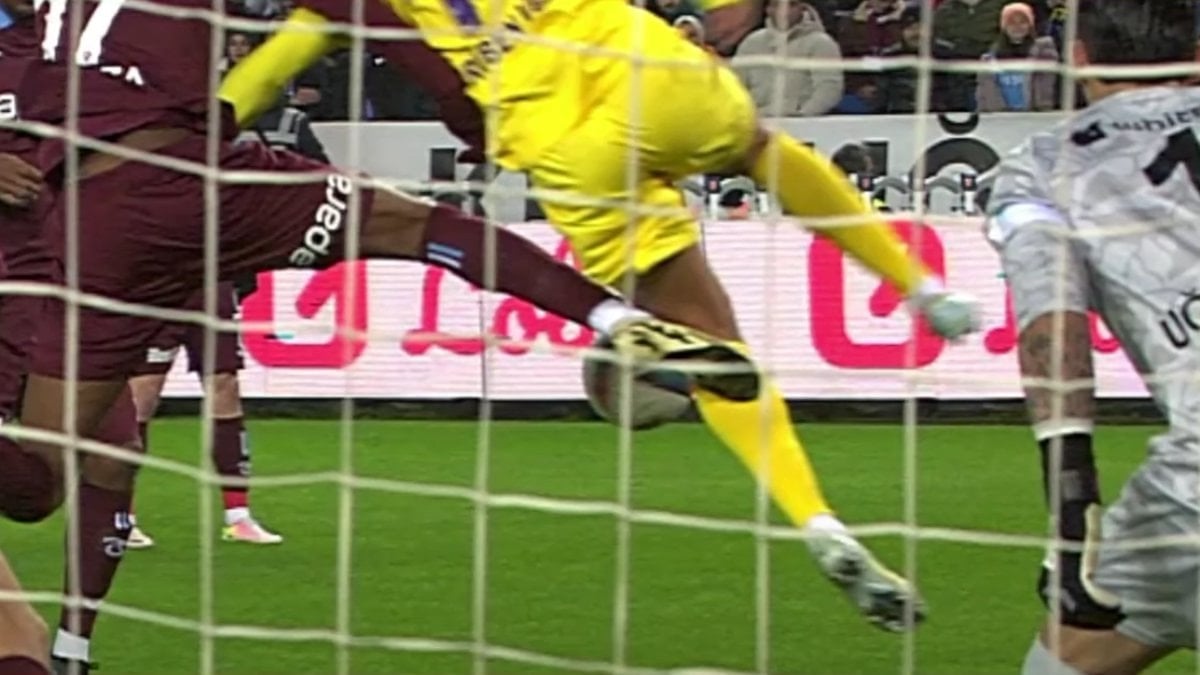 VAR: Sana penaltı nedeniyle sahada inceleme öneriyorum. Temas noktasına geri dön. Evet, bu bir temas noktası. Defans oyuncusunun bacağı ile topun arasında. Sana ağır çekimde gösteriyorum.