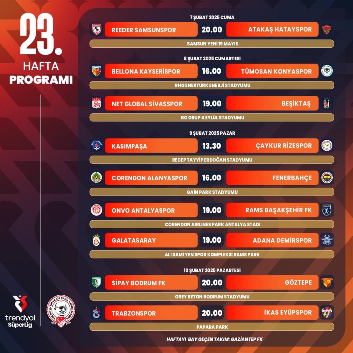 UEFA Avrupa Ligi'nde mücadele eden temsilcilerimizden, doğrudan Son 16 Turu'na yükselme ihtimali bulunan Galatasaray Spor Kulübü'nün; bu ihtimalin gerçekleşmesi ve 23. hafta sonrasında UEFA Avrupa Ligi Play-Off maçının olmaması halinde, yayın programı doğrultusunda, Trabzonspor A.Ş. - Eyüpspor müsabakası 9 Şubat Pazar günü saat 19.00'a, Galatasaray A.Ş. - Adana Demirspor A.Ş. müsabakası ise 10 Şubat Pazartesi günü saat 20.00'ye alınacaktır.