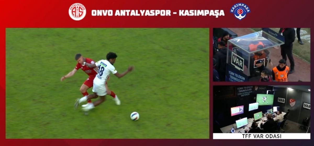 90+3. dakikada Antalyaspor atağında kaleci Kenan Piric’in kurtarışı sonrası Mamadou Fall’ın son çizgide dokunduğu top dışarı çıktı. Hakem Kayatepe, VAR uyarısıyla pozisyonu tekrar izledi ve Veysel Sarı’nın Fall’a kontrolsüz müdahalesini tespit ederek penaltı noktasını gösterdi.