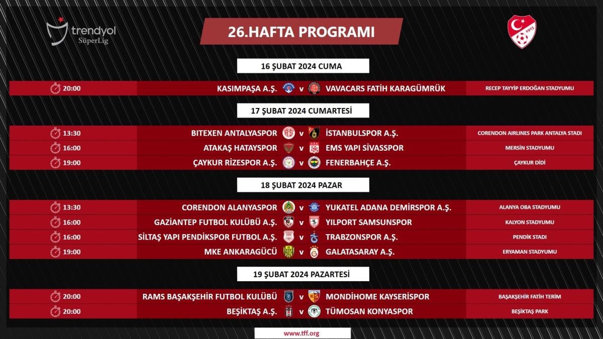 Türkiye Futbol Federasyonu'nun (TFF) resmi internet sitesinden yapılan açıklamada, Süper Lig’in 26. haftasında oynanacak müsabakaların günleri belli oldu.