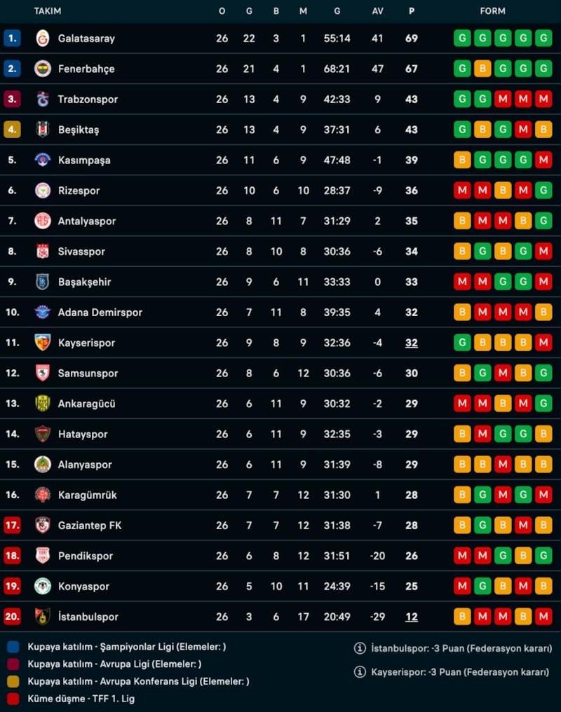 Süper Lig'de 26. hafta oynanan 2 maçla tamamlandı. Haftaya lider giren Galatasaray ve takipçisi Fenerbahçe puan kaybı yaşamadı.