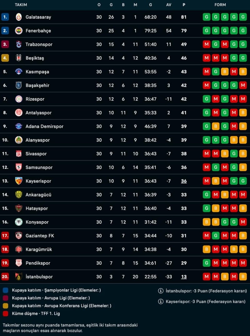 Süper Lig'de 30. hafta sona erdi. Şampiyonluk yarışındaki Galatasaray ve Fenerbahçe haftayı kayıpsız atlatırken sarı-kırmızılılar 2 puan farkla liderliğini sürdürdü.