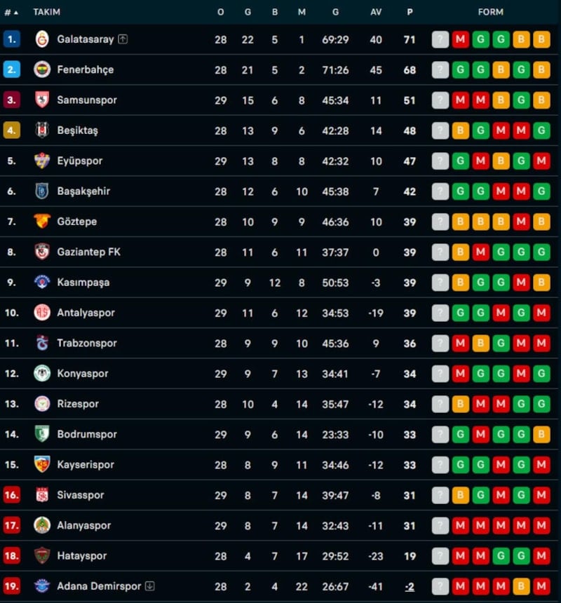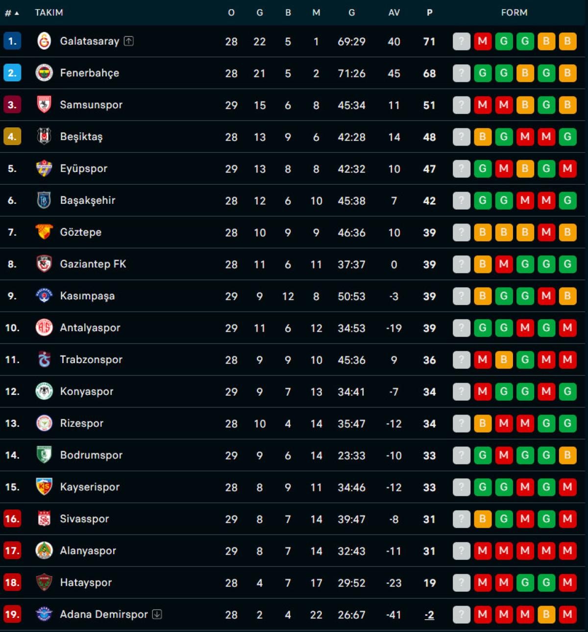Takipçisi Fenerbahçe ise zorlu Trabzonspor karşısına çıktı. Sarı-lacivertliler, 1-0 geriye düştüğü müsabakayı 4-1'lik skorla kazandı ve puanını 68'e yükseltti.