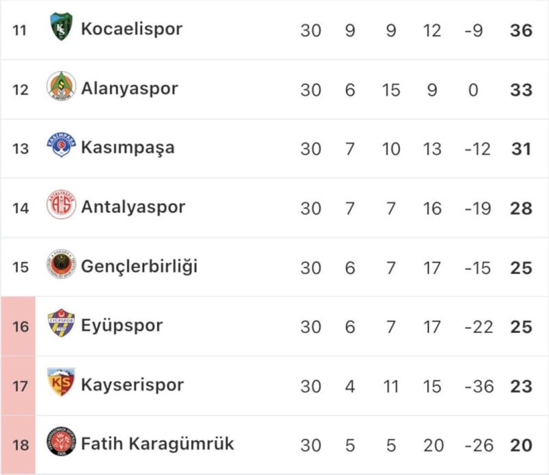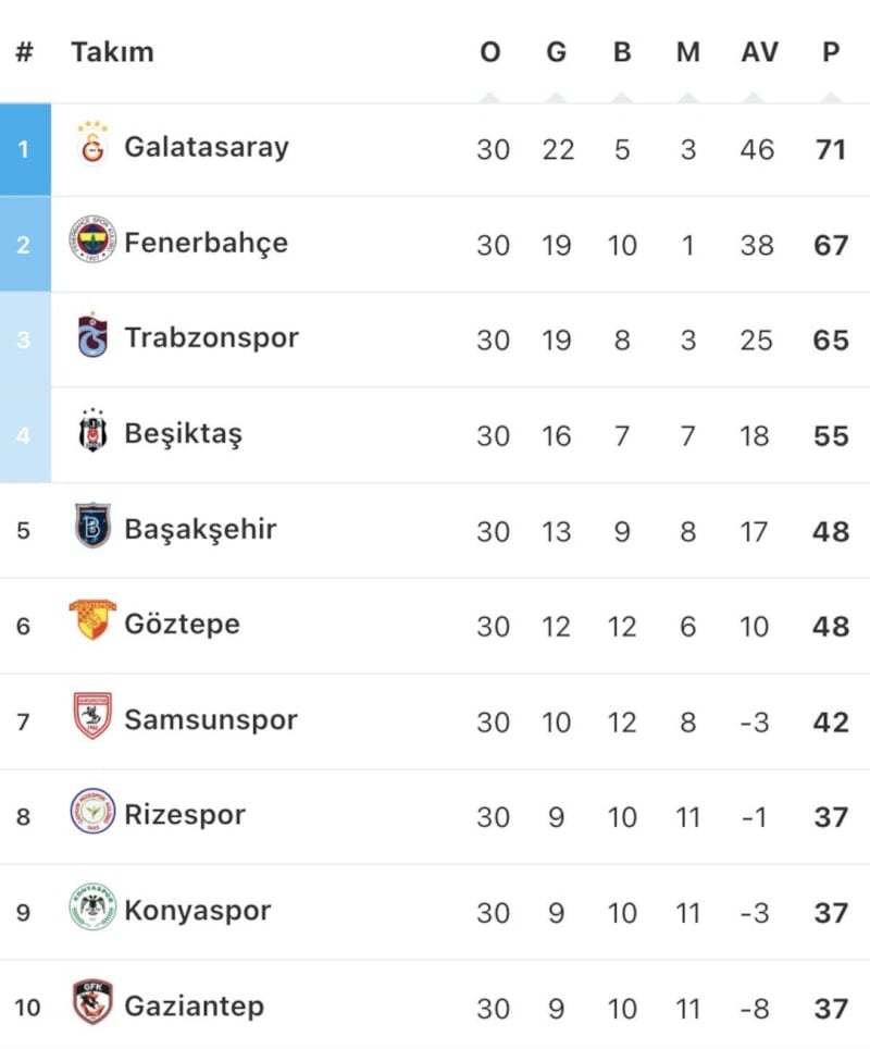 30. hafta maçlarının sonuçları ve puan durumu şöyle: