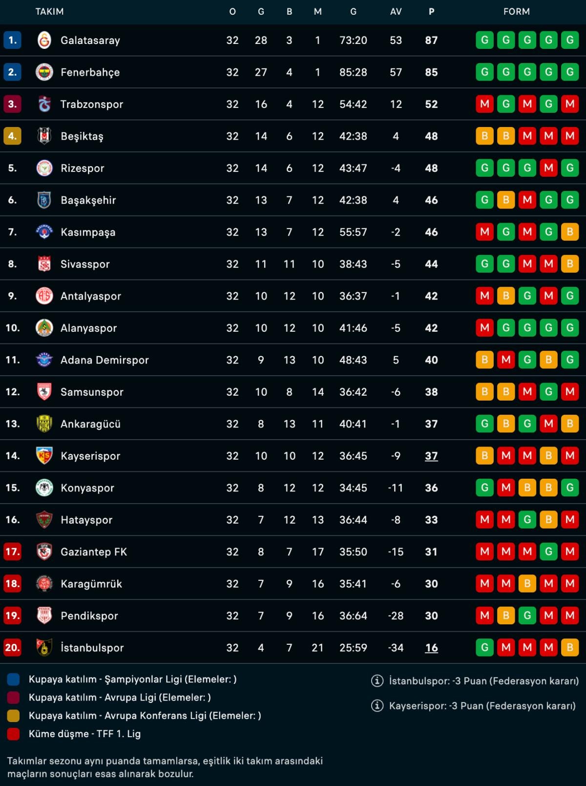 Kritik deplasmandan 4-0'lık galibiyetle dönen Galatasaray, puanını 87'ye çıkararak liderliğini sürdürdü.