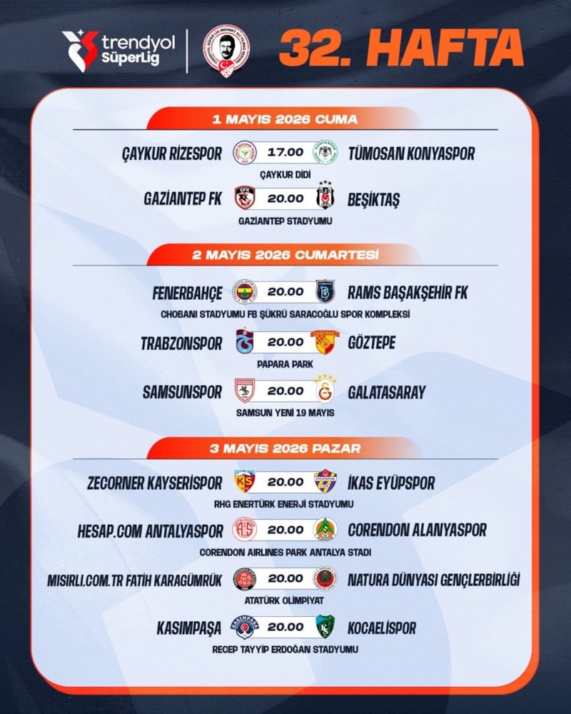 Türkiye Futbol Federasyonu'nun açıklamasına göre ligde 32. haftanın müsabaka programı şöyle: