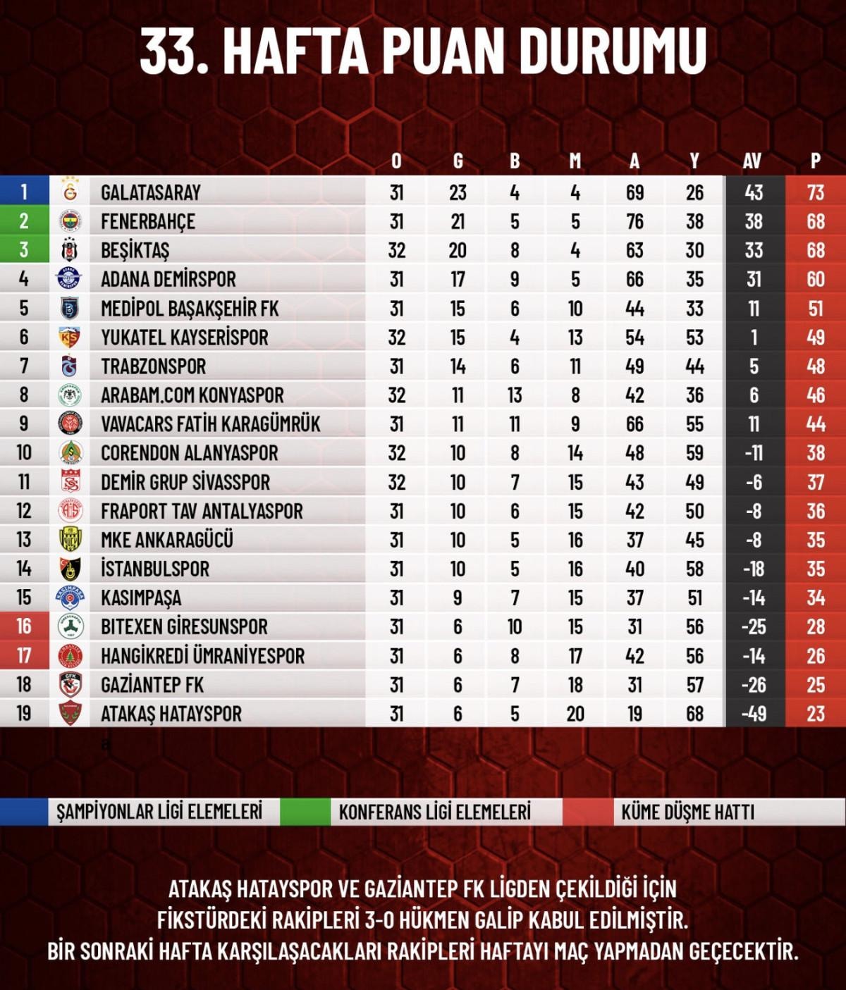 İşte 33. haftanın sonuçları, oluşan puan durumu ve 34. haftanın programı: