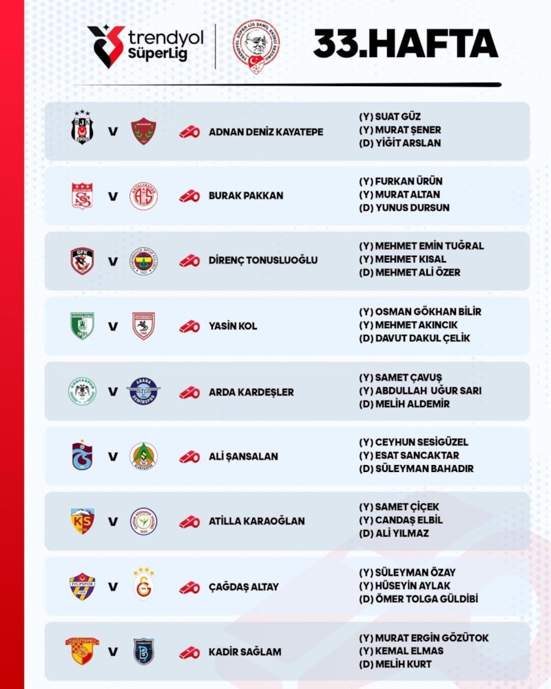 Süper Lig'de 33. haftanın programı ve maçlarda düdük çalacak hakemler şöyle:
