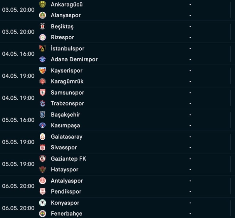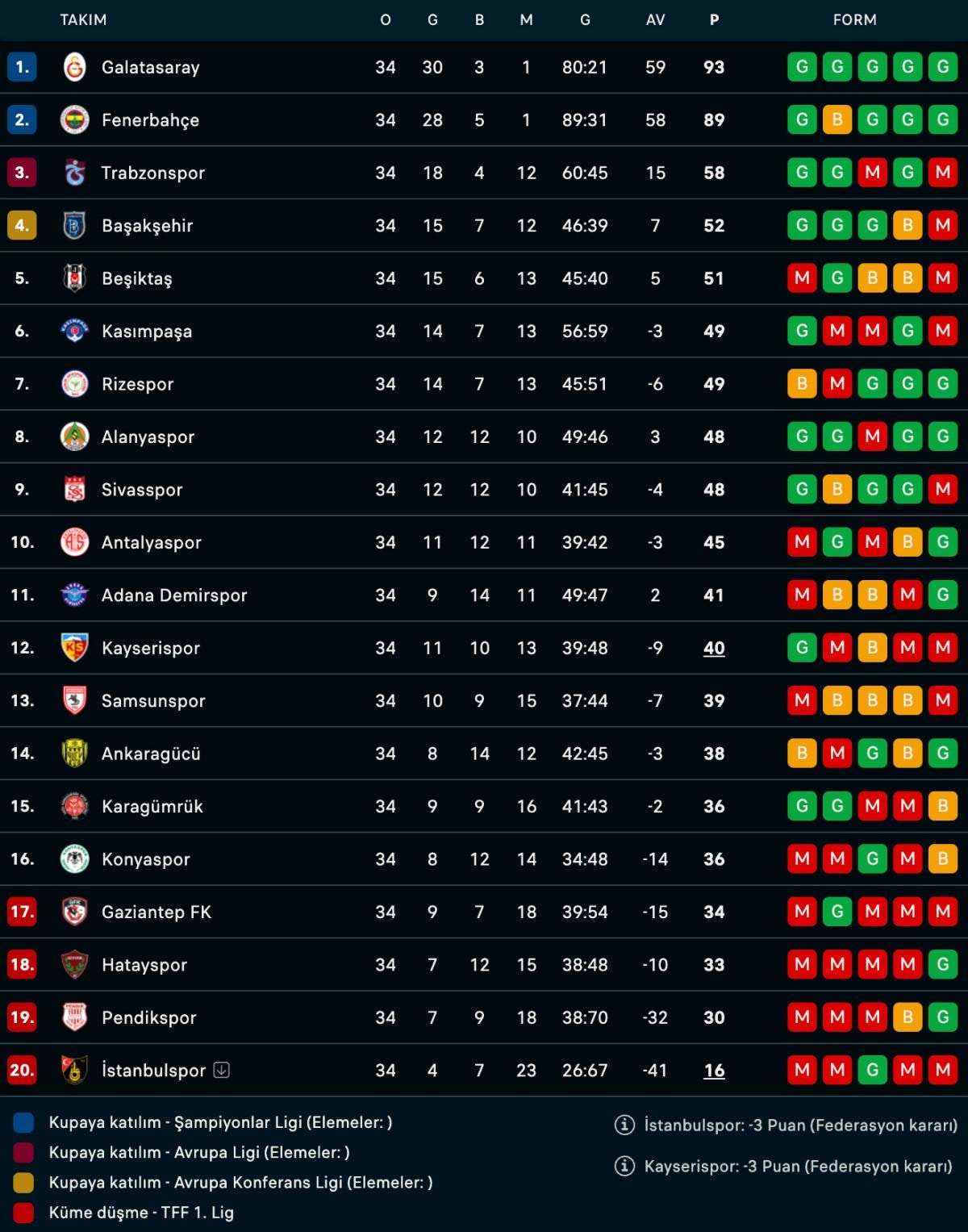 Ligden düşmesi kesinleşen İstanbulspor'un yanı sıra düşme hattında bulunan Pendikspor, Hatayspor ve Gaziantep FK, sahadan yenilgiyle ayrılırken 10 takımın daha ligden düşme ihtimali bulunuyor.