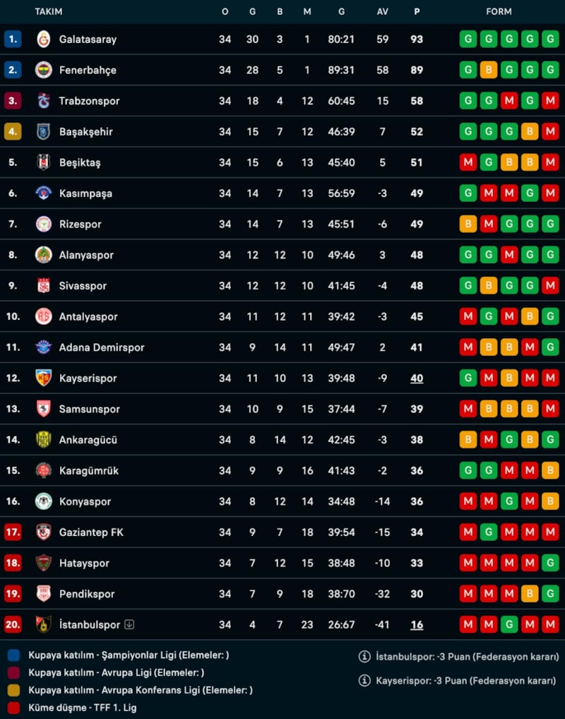 Süper Lig'de 34. hafta sona erdi. Lider Galatasaray galibiyet serisini sürdürürken Beşiktaş'ı mağlup eden Fenerbahçe haftayı derbi galibiyetiyle kapattı. Son 4 haftaya girilirken ligden düşmesi kesinleşen İstanbulspor hariç 10 takımın daha ligden düşme ihtimali bulunuyor.