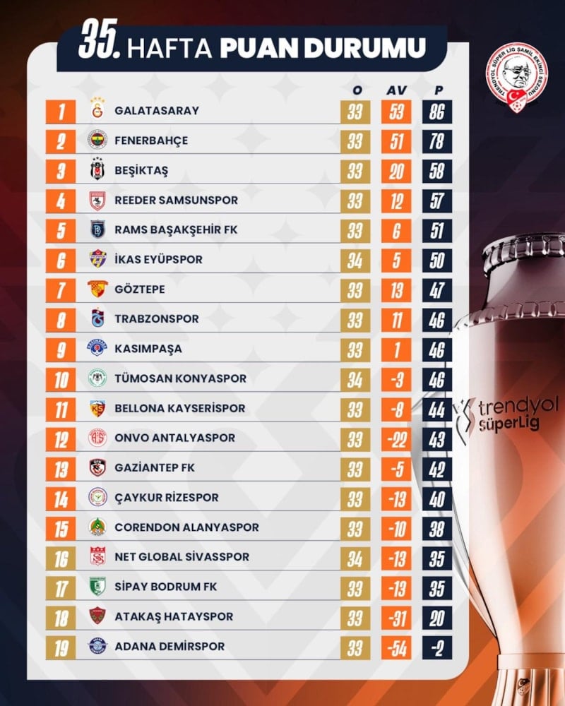 Süper Lig'de 35. haftanın perdesi kapandı. Trabzonspor'u 2-0 mağlup eden Galatasaray, puanını 86'ya çıkardı ve bitime 3 hafta kala en yakın rakibi Fenerbahçe'nin 8 puan önünde liderliğini sürdürdü.