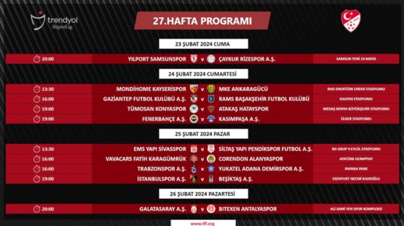 Ligin kaderini yakından etkileyecek olan 27, 28, 29 ve 30. hafta programları ise Türkiye Futbol Federasyonu tarafından duyuruldu.