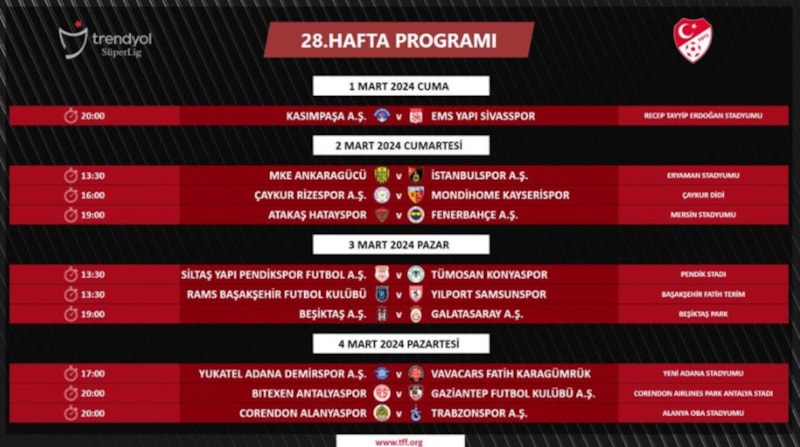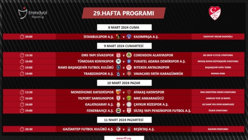 Süper Lig'in 30. haftasında ise Trabzonspor ile Fenerbahçe, 17 Mart Pazar günü saat 20.30’da karşı karşıya gelecek.